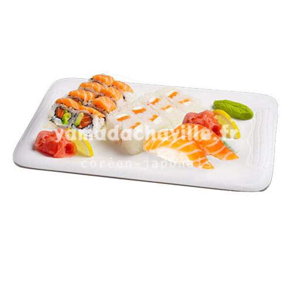 Tranches de Poissons sur du riz vinaigré, servi avec 1 soupe🥣 et 1 salade🥗, + 🥑Avocat +1.50€